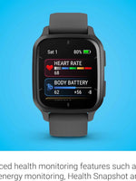 Enjoy seamless connectivity with Bluetooth notifications, app syncing, and music control, all while experiencing a long-lasting battery life that powers you through multiple days of use. With its sleek Slate and Shadow Gray design, the Garmin Venu Sq 2 is a stylish, reliable smartwatch built for both wellness and performance.