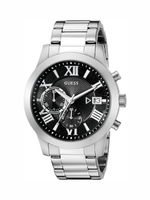 Black chronograph dial with silver-tone Roman numerals and date window.