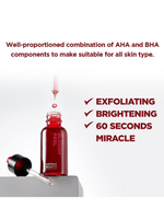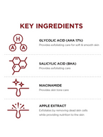 Formulated with 17% AHA (Glycolic Acid) and BHA (Salicylic Acid), this peeling solution effectively removes dead skin cells, unclogs pores, and refines rough texture. Infused with apple fruit extract and Vitamin C, it gently brightens dull skin while supporting skin clarity and radiance.